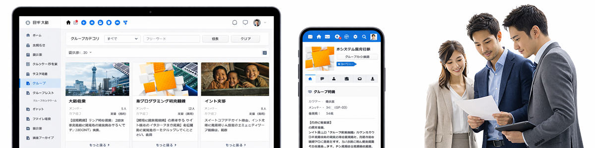 分科会やサークルといった団体内のグループ単位で、名簿の管理・掲示板の利用・ファイル共有・スケジュール表示ができます。事務局管理者によるコントロールの下、各グループにみなし管理者をおくことで、柔軟なグループ管理ができます。